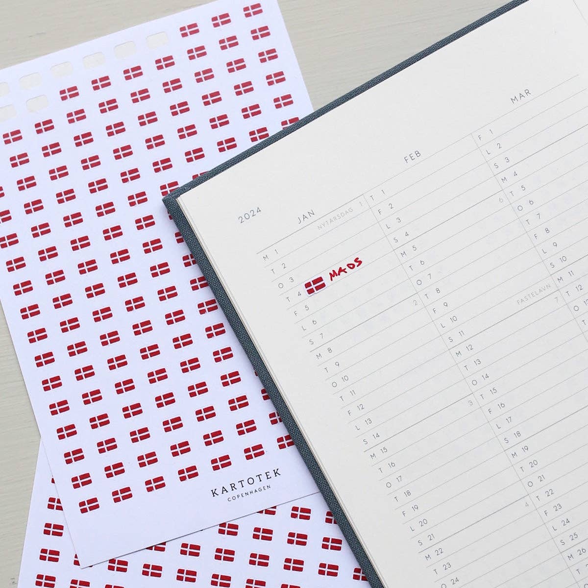 Klistermærker fra Kartotek København med vores eget design af mikro danske flag til at lyse op i din dagbog eller kalender, forskønne dine gaver eller sætte på breve. * Størrelse på klistermærkeark: A6 * Størrelse på flag: 3 x 6 mm * Trykt i Danmark på 70gsm hvidt papir