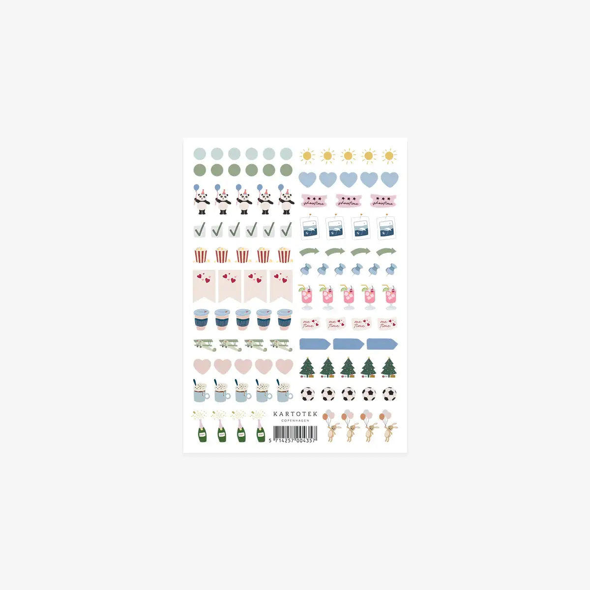 Søde og charmerende klistermærker fra Kartotek København til at lyse op i din dagbog eller kalender, forskønne dine gaver eller sætte på breve. * Størrelse på klistermærkeark: A6 (105 x 148,5 mm) * Trykt i Danmark på 70gsm hvidt papir