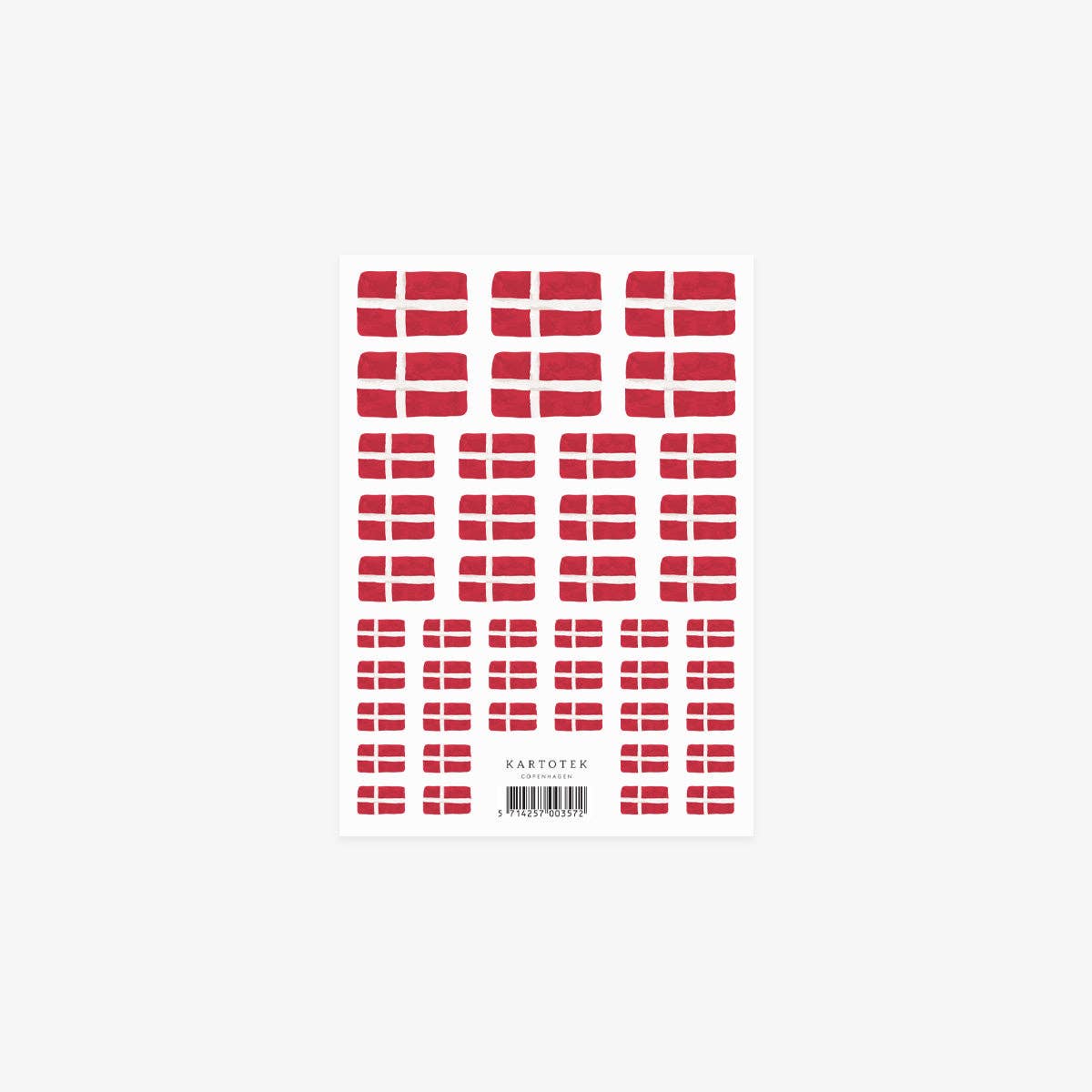 Klistermærker fra Kartotek København med vores eget design af danske flag til at lyse op i din dagbog eller kalender, forskønne dine gaver eller sætte på breve. * Størrelse på klistermærkeark: A6 * Størrelse på flag: * Størrelse 1: 10 x 16 mm * Størrelse 2: 12 x 21 mm * Størrelse 3: 17 x 28 mm * Trykt i Danmark på 70gsm hvidt papir