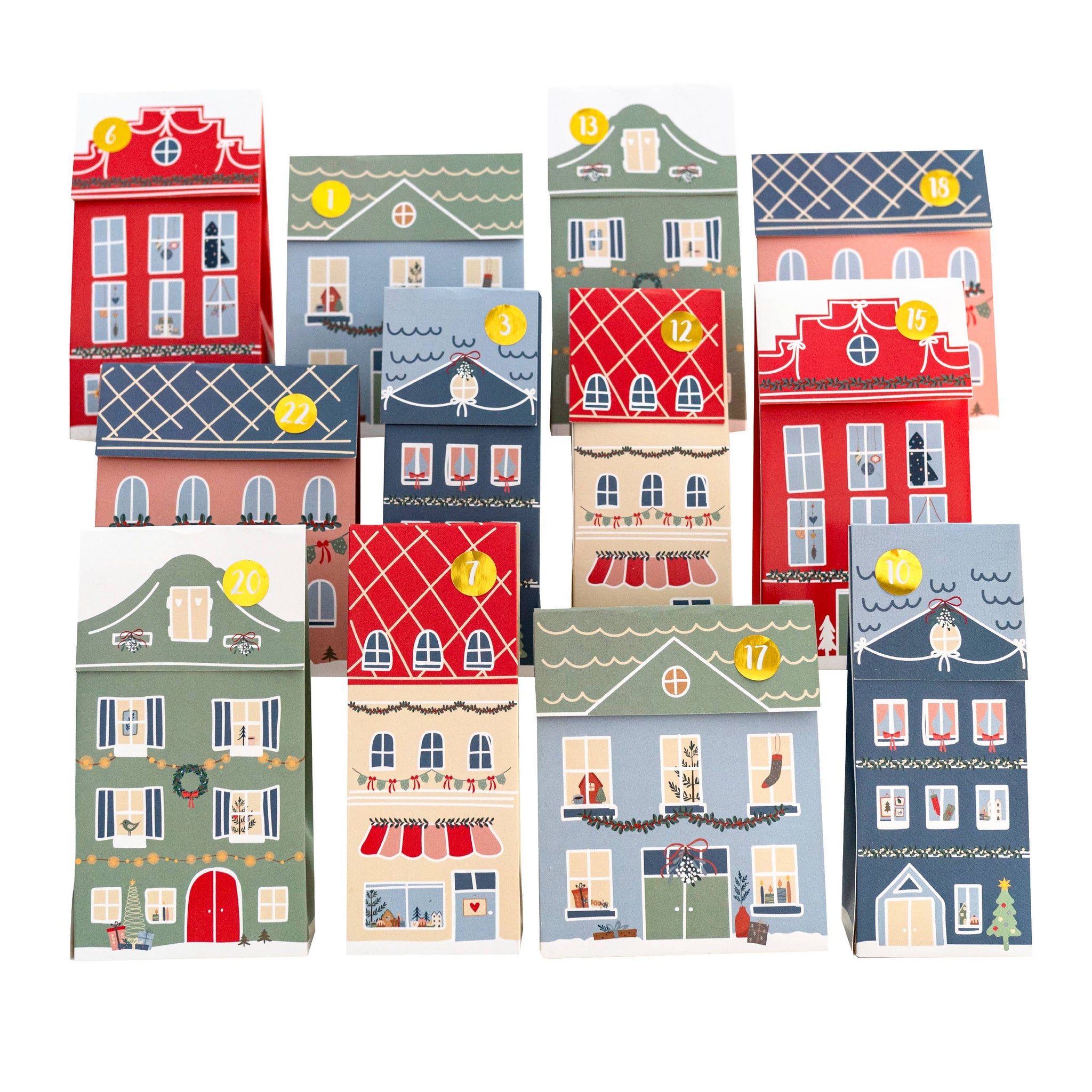 Indhold i kassen: • 24 huse til at samle og fylde • 24 klæbepunkter• Nummerklistermærker fra 1-24